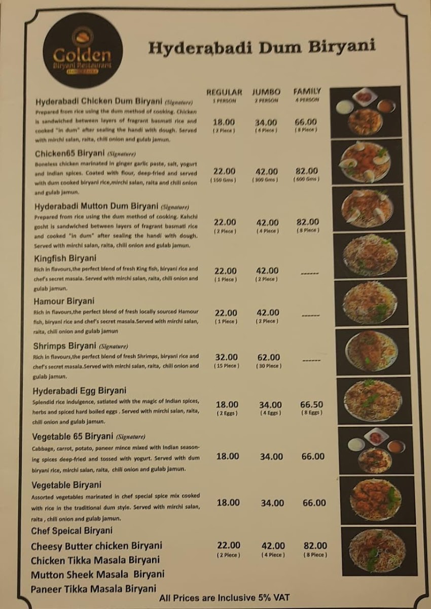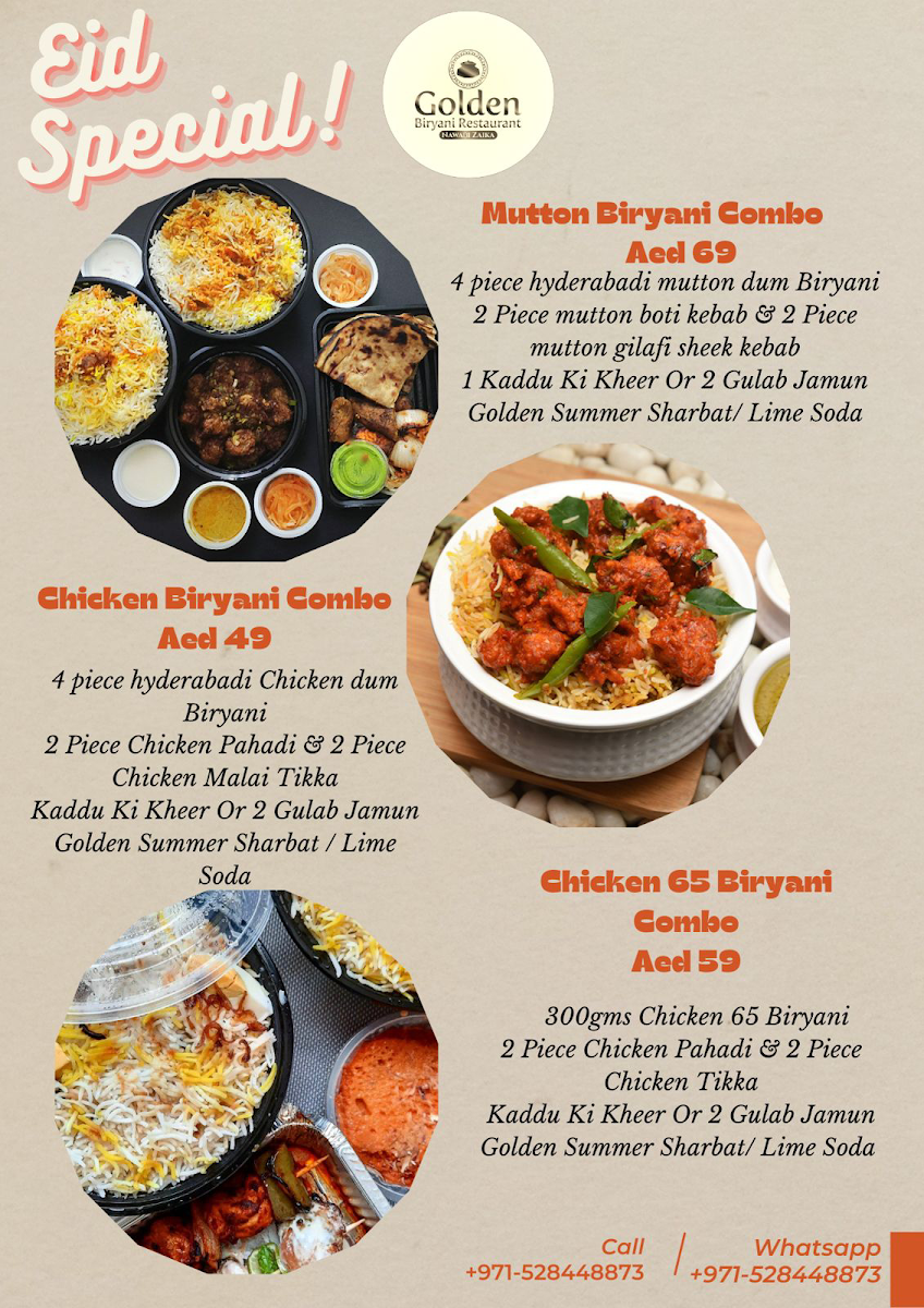 “ If you’re a true biryani lover, Golden Biryani in Dubai is an absolute must-visit! From the moment you walk in, the aroma of freshly cooked spices and flavors hits you—setting the tone for a delicious experience. The biryani here is a perfect blend of rich flavors, tender meat, and fragrant basmati rice. Whether you go for chicken, mutton, or the vegetarian option, every bite is packed with authenticity and love. The portion sizes are generous, the pricing is pocket-friendly, and the taste? Simply unforgettable! What makes this place stand out is not just the food, but the warm hospitality. The staff is friendly, quick, and always ready to recommend the best dishes. The ambiance is simple yet comfortable—perfect for a casual dine-in or a quick takeaway. Highly recommended for anyone craving authentic, flavorful biryani in Dubai. Golden Biryani truly lives up to its name! ”